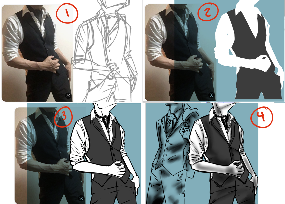 Process: 1) messy sketch 2) shape blocking 3) line art 4) shadow