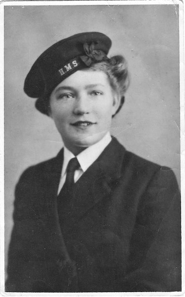 She's a 1940's style Steiff bear (ex. [1]) dressed in a homemade Wren (Women's Royal Navy) uniform, (ex. [1][2]). For some reason, someone has clipped an ID badge to her front with her name, 'Molly', then just below that 'SCAUP Division' (or SCAUP Div if it doesn't quite fit!), then after some lines of miscellaneous text it says 'If I am lost ->'