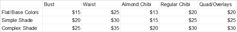References: (refs of your character/HA) Personality: (in a few words) Type: (almond, regular chibi, bust, waist) Shading Style: (flat, simple, complex) Additional Info: (feel free to suggest a pose if you have something in mind!) Payment: (csc or usd)