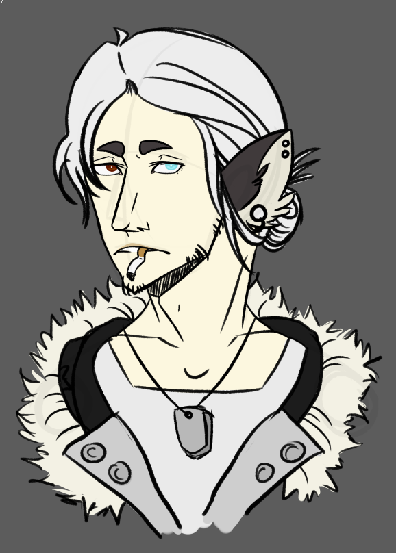 his name is noel and he's a werewolf (werewolfdog if u wanna be specific but) his whole thing is that he's a wanderer who people constantly assume is some sort of criminal but honestly he just likes wandering the land lmao even tho he?? seems to be followed by bad luck wherever he goes lowkey chaotic stupid. blunt, has 0 class whatsoever, kinda mean ngl. but?? loyal af and a genuinely nice guy deep down