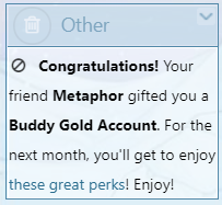 So recently I've been feeling a little down, and going on Subeta has been helping me a bit - I like to play the HA games and play with the wardrobe. So I logged on today and as usual take a look at any "events" that have happened since I was last on. As per the norm, I got pinged for the various groups I tend to take a peak at, and then found one that stuck out more than the rest: I'd been gifted with a 1 month gold account.