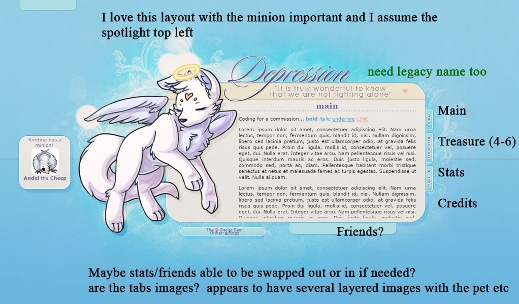 Strange request but I'm looking for a template pet profile I'd be able to edit by myself. I just kinda need the starting point because I have a difficult time organizing a layout (See my pet Elfric for how horrible I am at it). I want to be able to interchange my own images and font colour etc. since I know how to read and work with coding. This template would be used on 6 of my pets since they're all related in a way, so was wondering if that's something feasible? I'd pay extra for the template coding since it is an odd request?