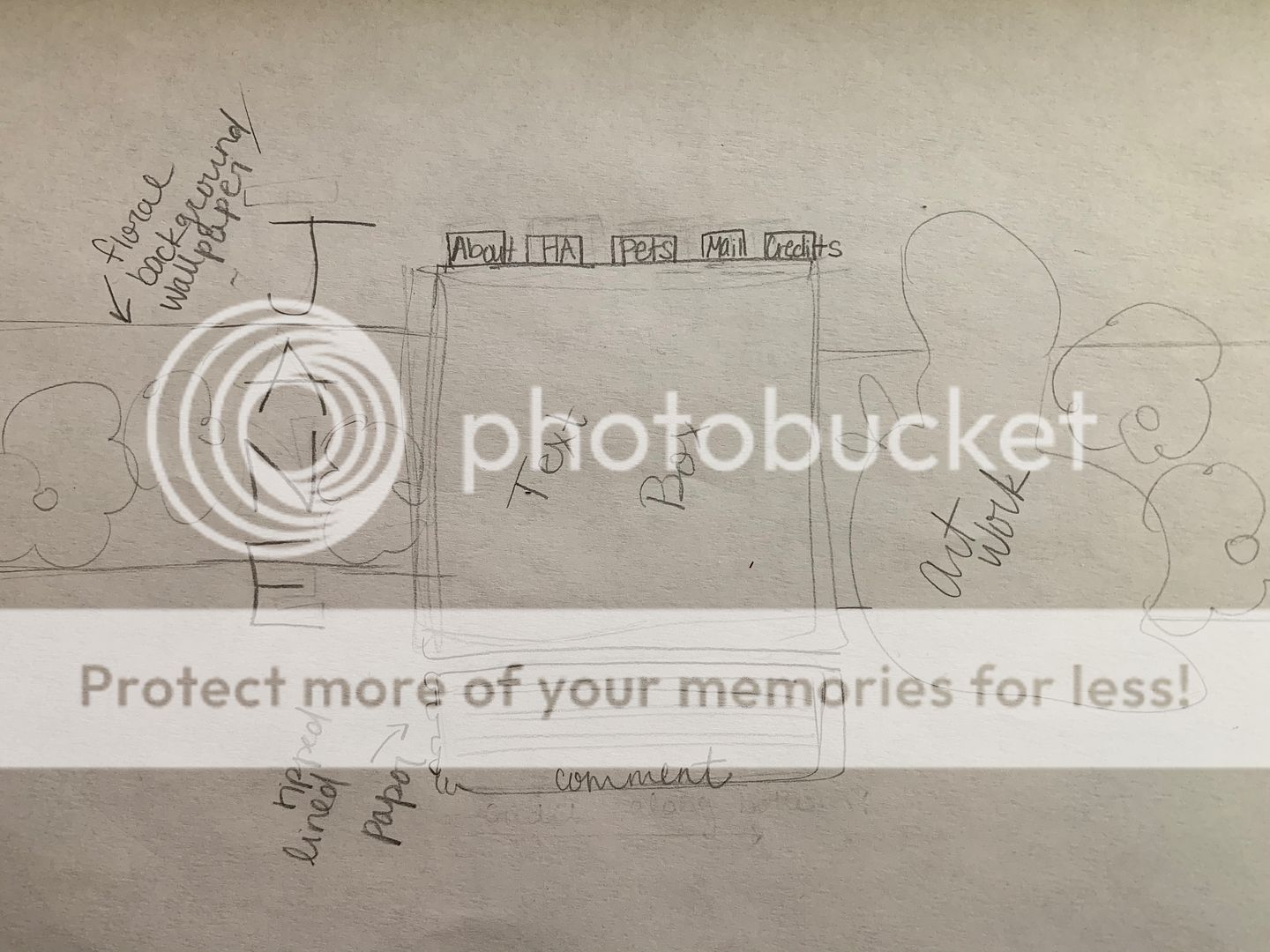 User Name: Jane Image(s): This HA artwork and maybe this or this. Or something similar! Colors and styles preferred: I like muted tones, but I also want the profile to be light and airy. Text: Just my username in a font like Good Mood or Sunrise International. Basically, an all-caps, fat, handwritten font that doesn't look like a child wrote it. Type: No scroll. Specifics on layout placement: I drew a picture! I really want the text box centered. I would also like it to fit three pet buttons across. My profile currently fits two across. Hover/Drop down: I would love the top tabs to pop upward when hovered on. Buttons: About, HA, Pets, Mail, and Credits. Extra Info: I would like for there to be an opacity over the About and HA sections. I would like there to be an opacity over my pet buttons like there is now.
