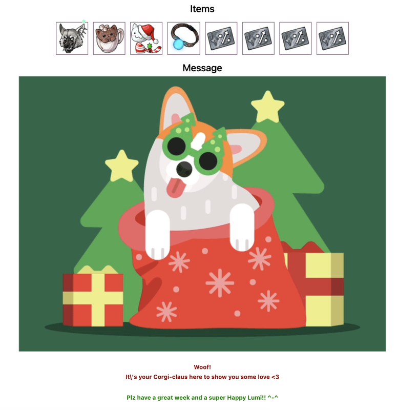 Items Message I hope you've been doing well. All the best for the coming year! n___n ♥
