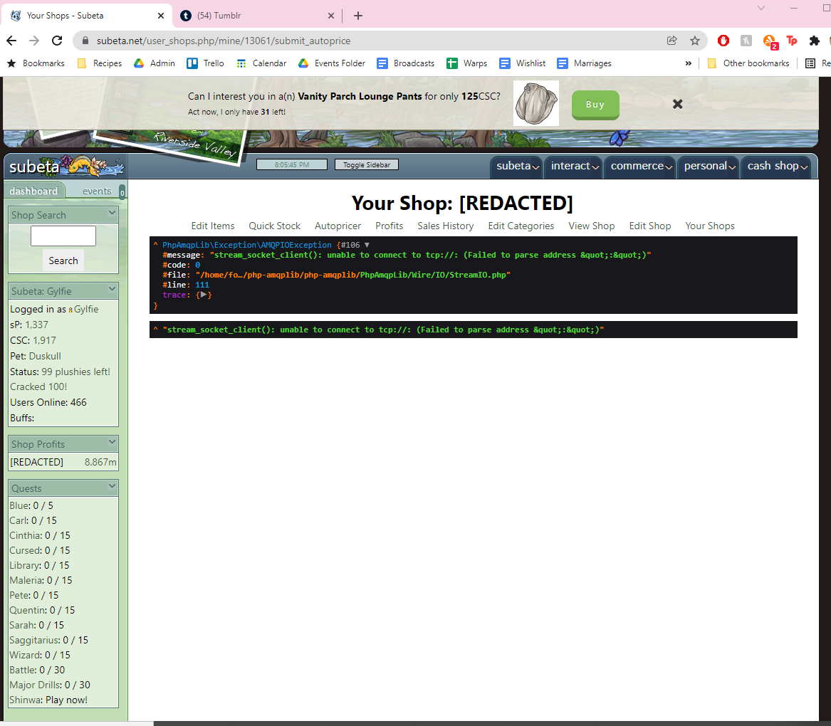 Yes, got this just now. So wardrobe, HAs, luminaire trees and now autopricer all broken. Reminds me of the last few days of morostide when half the site was not working.