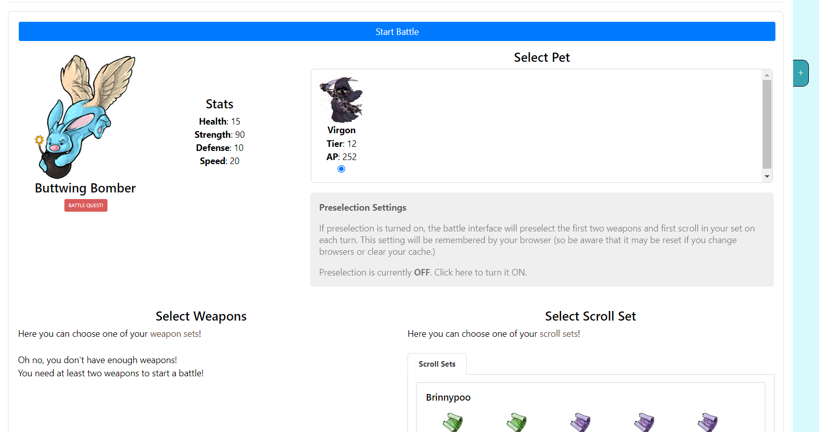 I can't do Battle Quests at all either because it won't let me select weapons D: