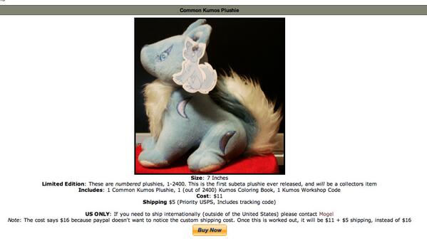 it was $11 per Plushie and $5 for shipping and they could only send one at a time so $16 per plushie :). And it came with a Kumos coloring book.