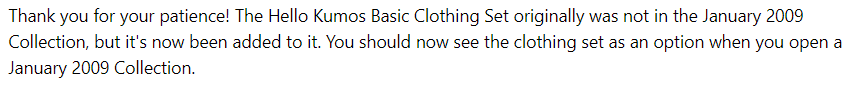 I would try an Account Search for the clothing set just in case, and then filing a ticket. I can't find anything official that mentions that the clothing set is supposed to come with the kumos but the item IDs are one after another, so they would've been created (and then were likely released) around the same time. It's possible the item is bugged if it is actually supposed to come with the doll