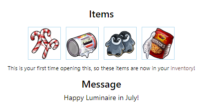 Items This is your first time opening this, so these items are now in your inventory!