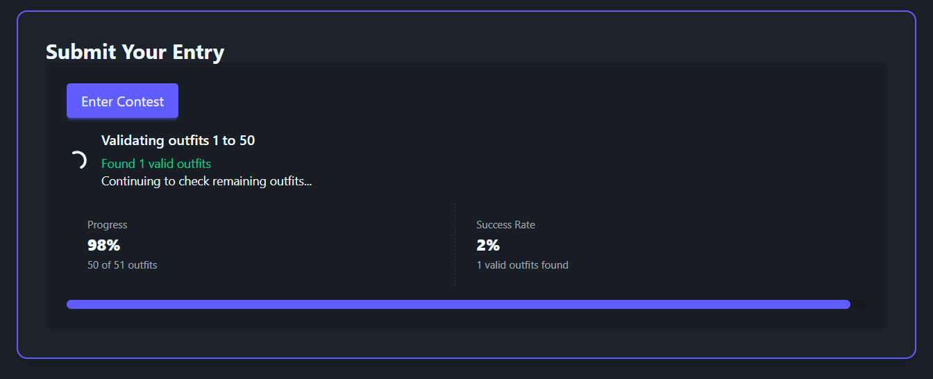 It just does not seem to load my outfits for the "Crowning Glory" contest. I tried marking as many as my patience allowed for as private, but that does not seem to have affected it. I think the analysis is getting stuck on one of the first fifty outfits, as even when left to run for hours it never advances past "Validating outfits 1 to 50"