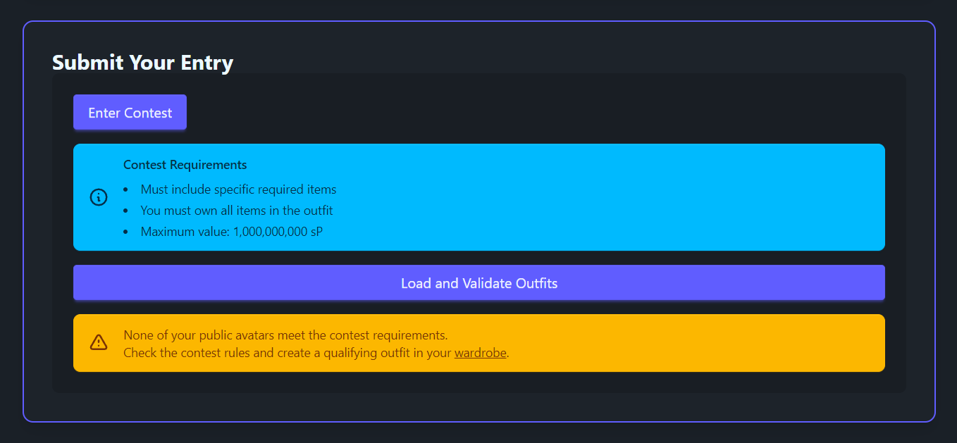 I am still unable to enter the "Crowning Glory" contest, as I receive the following error: "None of your public avatars meet the contest requirements. Check the contest rules and create a qualifying outfit in your wardrobe."