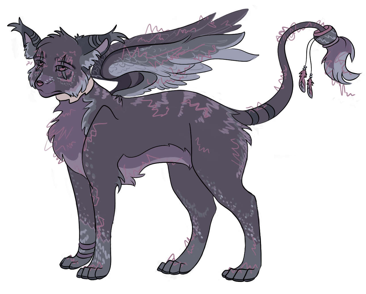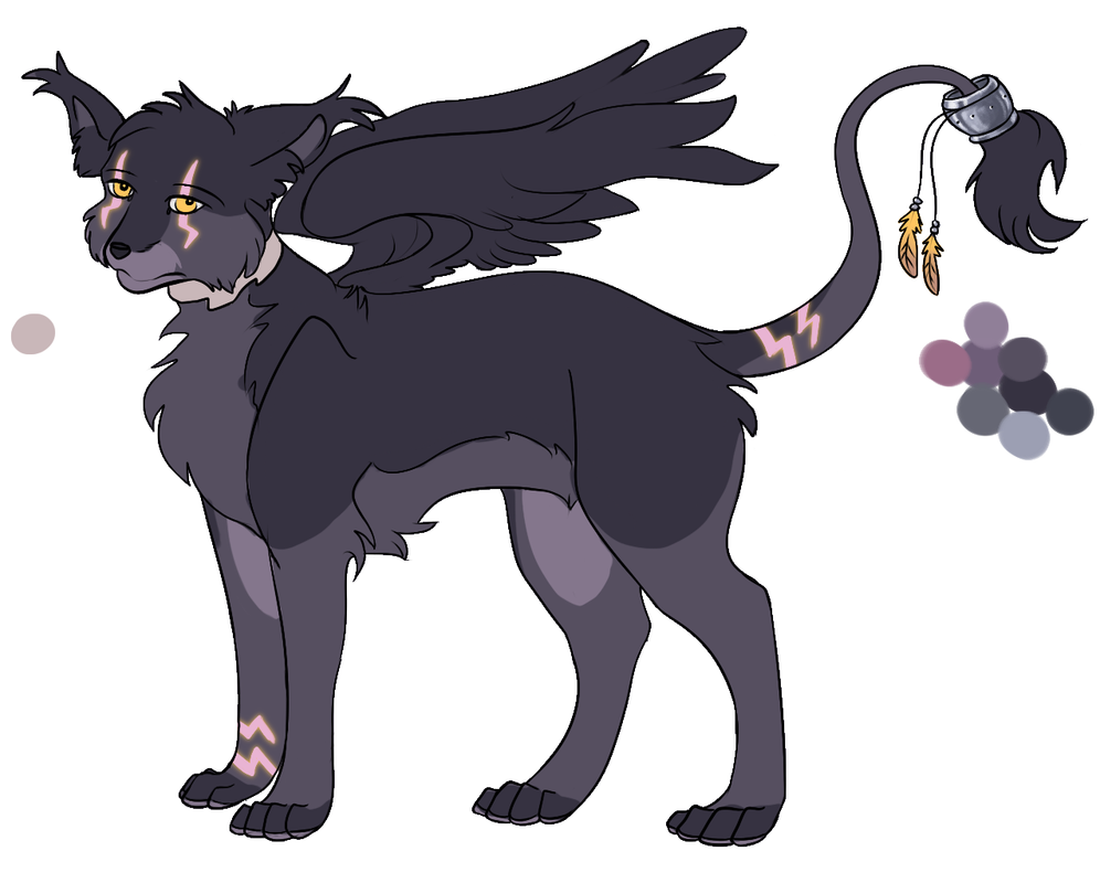 I felt like darker colors work best as his base given his personality - muted, eeyore-like. Then his strength - his lightening - is where he "shines". I did a quick flip side too, because I like the idea of him having three bolt chains on one side and two on the other. In my mind, the lightening "glows" when he's using his powers. I liked some other ideas that I debated adding, like hints of a second color in the fur on his face and the tips of his wings, but I knew it would look bad if I tried and I didn't want to take too much away from his lightening pattern. I also figured you could either have a specific lightening pattern or you could make it part of the lore that his lightening can "shift" on his fur when he is using his powers, and thus it's not a pain to get art made of him because it's just the general three on one side down the leg, two on the other side and down the leg lol.