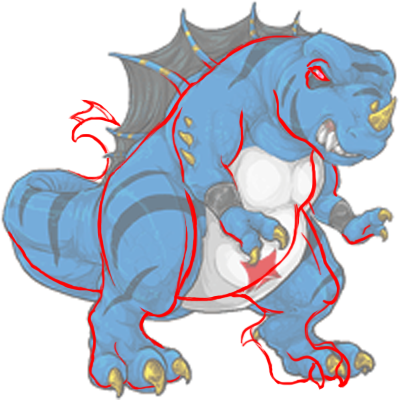 Something about this one bothers me. The black beneath the eyes makes it look like he has a bad case of bags, the face just doesn't seem 'snarly' or vicious and looks rather, well, wonky, to be frank. Something about the way he's shaded makes him look almost chubby and like one of those old rubbery Godzilla toys. The way the tail bends throws me off, too. Maybe if it almost wrapped around the other way where the tip is visible would help? Seeing as he appears as though he should be aggressive or defensive I'd like to see the tail loosely wrapped about his form as if to provide a barrier. It's just something you typically see on angry dinosaurs and dragons, y'know? Overall he seems pretty bulky to the point it almost crowds the little white square he's in. Sorry, but I don't really like the revamp at all. ;; It's nice and definitely needed, but I think a different redraw would do better.